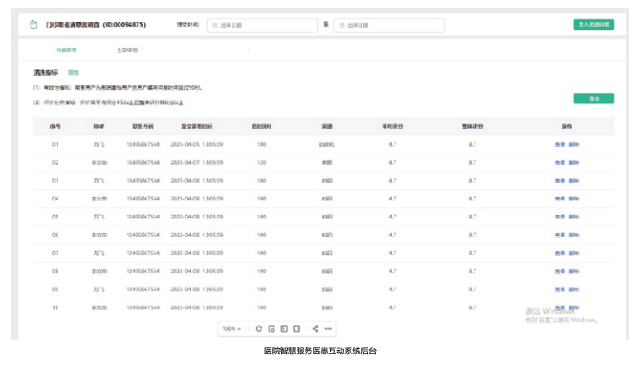 (2)醫(yī)院滿意度調(diào)查模塊:PC管理端支持滿意度調(diào)查問(wèn)卷內(nèi)容設(shè)置、調(diào)查問(wèn)卷發(fā)放、調(diào)查結(jié)果統(tǒng)計(jì)、 調(diào)查結(jié)果應(yīng)用;患者用戶端支持患者通過(guò)自助機(jī)、手機(jī)填寫(xiě)滿意度調(diào)查問(wèn)卷;調(diào)查結(jié)果統(tǒng)計(jì)具備數(shù)據(jù)清洗 處理機(jī)制精準(zhǔn)結(jié)果服務(wù)。