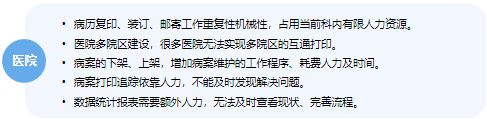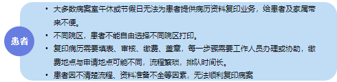 住院病案是醫(yī)療過(guò)程文件,對(duì)于治療、康復(fù)和管理有重要作用,也是臨床教學(xué)、疾病研究和預(yù)防、司法鑒定、傷殘認(rèn)定、醫(yī)保報(bào)銷和商業(yè)保險(xiǎn)報(bào)銷等的重要依據(jù),因此病案打印需求量持續(xù)較高。傳統(tǒng)病案復(fù)印存在以下痛點(diǎn):