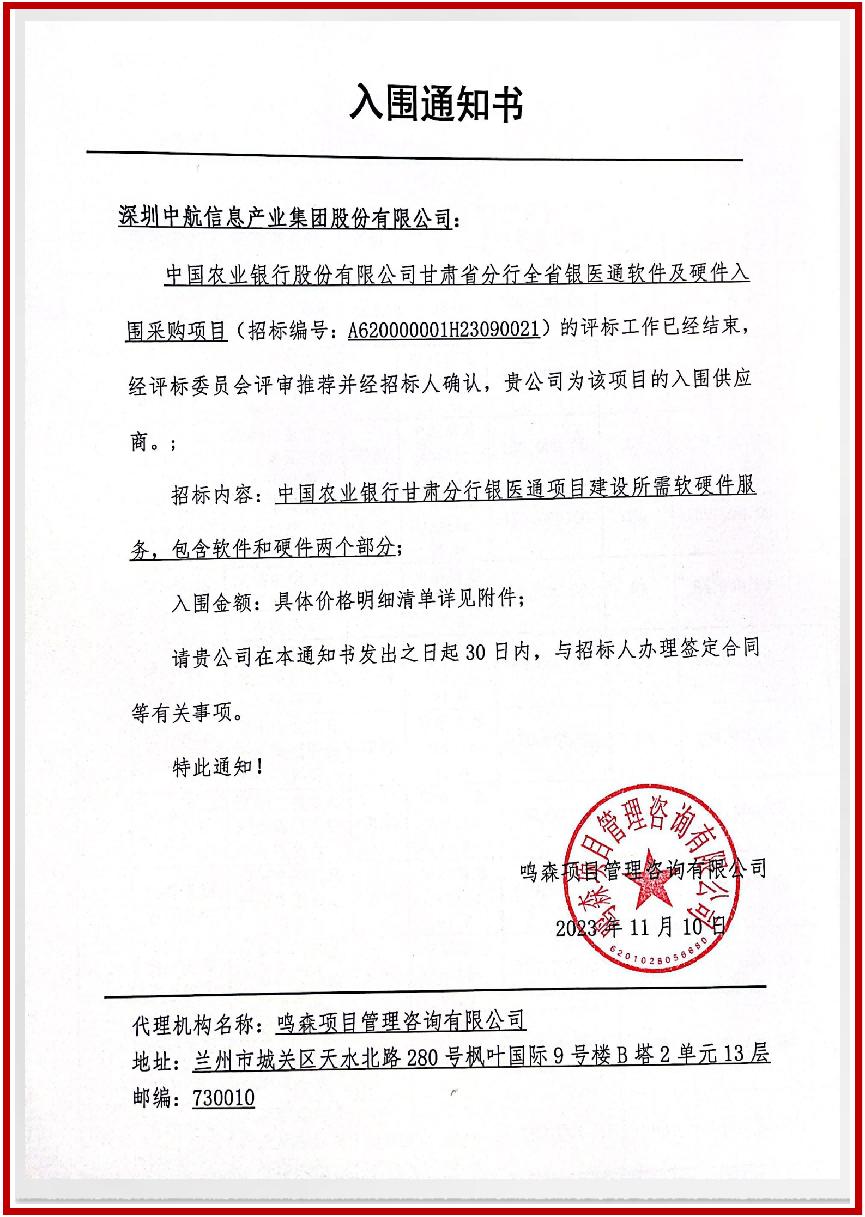 金秋時節(jié),碩果累累!熱烈祝賀深圳中航信息產(chǎn)業(yè)集團股份有限公司成功中標“中國農(nóng)業(yè)銀行股份有限公司甘肅省分行全省銀醫(yī)通軟件及硬件入圍采購項目”。